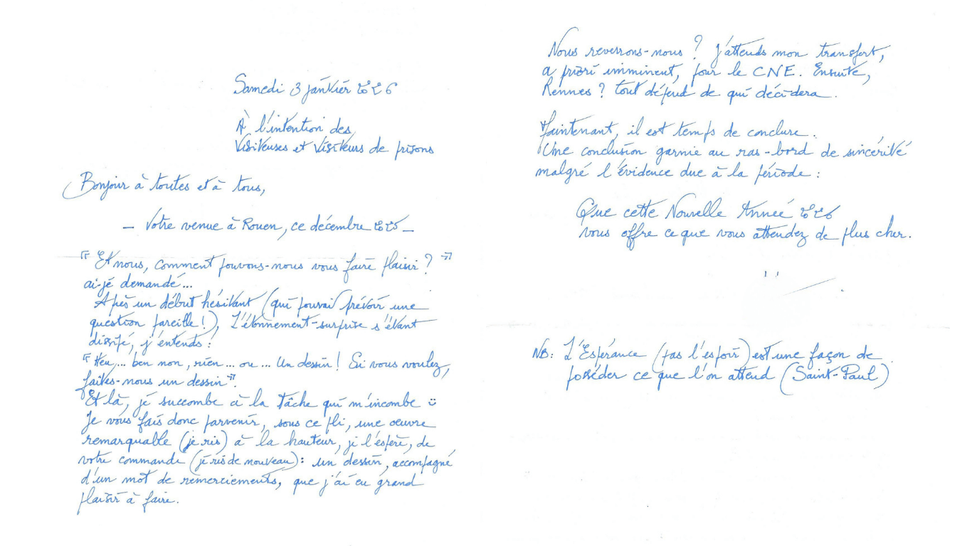 L’équipe reçoit aussi des lettres en retour, notamment de la MAF (Maison d’arrêt femmes), où des personnes détenues témoignent de la différence que fait cette présence dans leur quotidien à la maison d’arrêt. Elles y disent combien une visite, un atelier, un colis ou un courrier peuvent alléger une journée, redonner un peu d’espérance et faire sentir qu’on n’est pas complètement oublié.