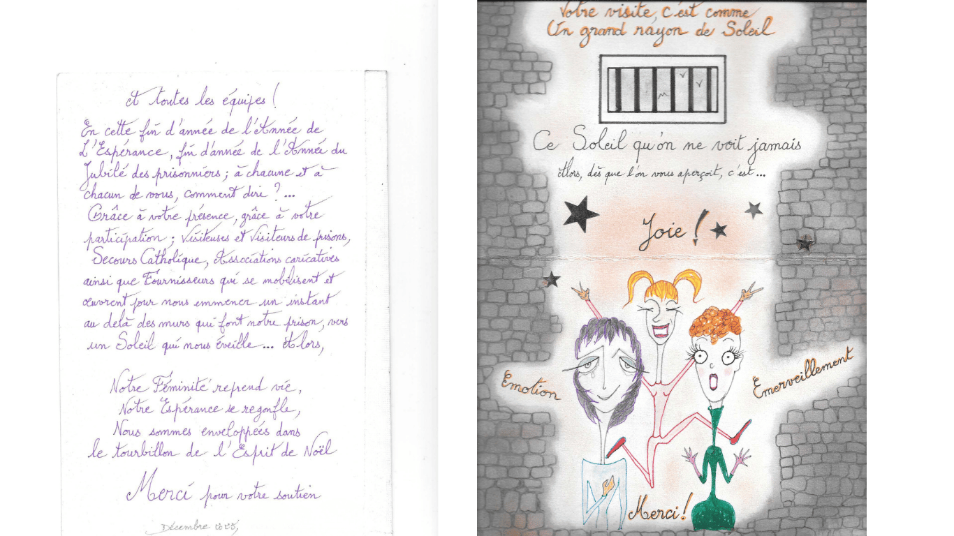 En parallèle, l’accompagnement « au-delà des murs » permet à des personnes détenues d’entretenir un lien régulier par courrier. Ces échanges épistolaires sont souvent un soutien précieux : recevoir une lettre, savoir que quelqu’un pense à soi, peut redonner courage et dignité à des moments où l’on se sent oublié de tous.